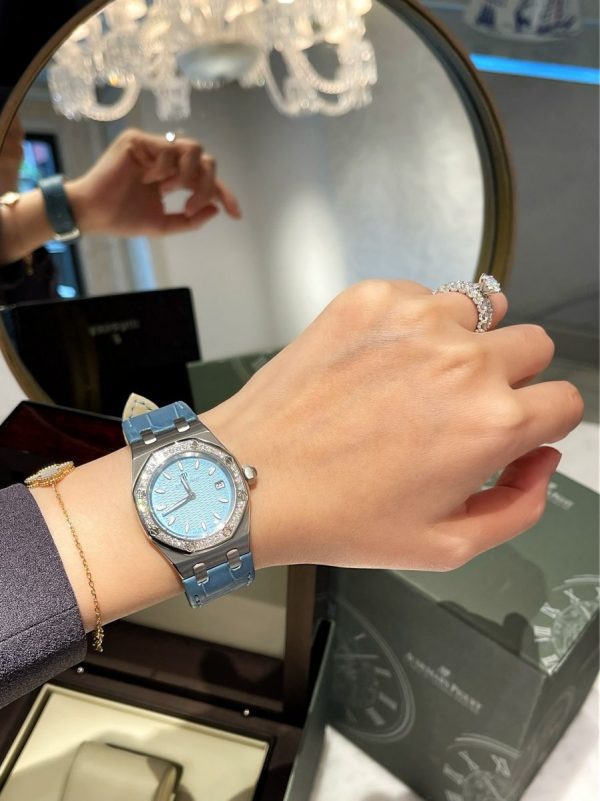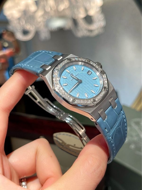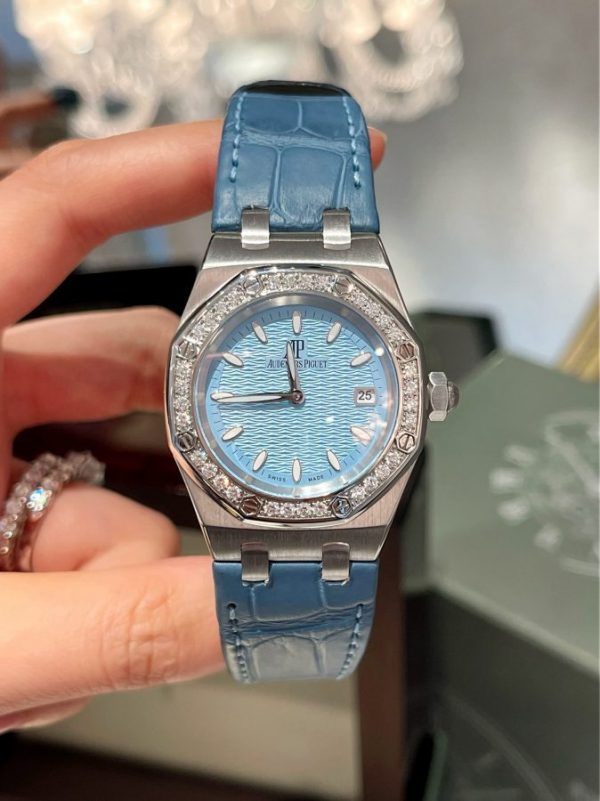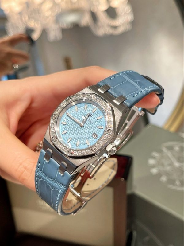 Audemars Piguet Royal Oak Ladies Gem-set Quartz Steel có đường kính 33mm chiếc đồng hồ này rất hợp cho các tín đồ đồng hồ thích phong cách thể thao cá tính.