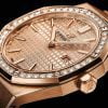 Với vỏ 33mm bằng vàng hồng 18ct. Gờ được đính kim cương bằng vàng hồng 18ct. Các ốc vít có thể nhìn thấy được. Mặt số màu xanh lam với họa tiết “Méga Tapisserie”.