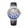 Về thiết kế bên ngoài, phiên bản này có thiết kế vỏ làm từ vàng trắng 18K với dáng mặt số tròn, đường kính vỏ 35,8mm. Chiếc đồng hồ này đã tạo nên ấn tượng sâu sắc bởi sự lấp lánh của những viên đá quý đính quanh viền bezel và mặt số.