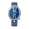 Đồng hồ đeo tay Breguet Reine de Naples Automatic 35mm Ladies. Chuyển động tự lên dây cót. Cân bằng lò xo và bộ thoát bằng silicon. Mặt số làm bằng ngọc trai tự nhiên màu trắng với các chữ số Ả Rập Breguet. Mặt sau bằng sapphire. Chống nước đến 3 bar (30 m). Kích thước: 43,75 x 35,50 mm. Ngoài ra với xà cừ tự nhiên màu xanh lam. Có sẵn trên một vòng đeo tay bằng thép. Mẫu đồng hồ sử dụng dây vải.