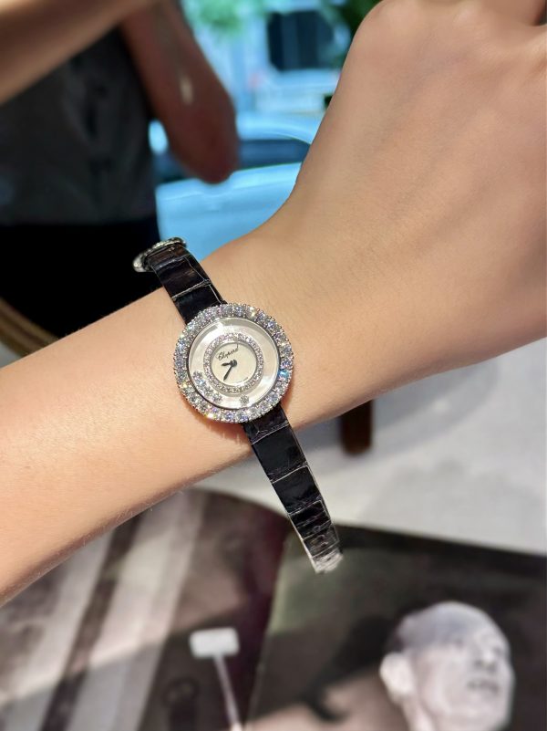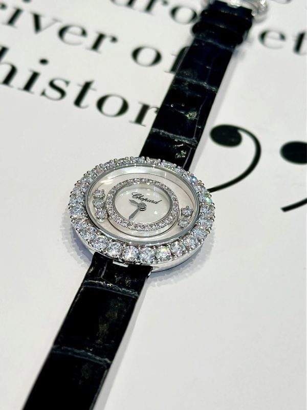 CHOPARD HAPPY DIAMONDS 205369-1001 18K DIAMONDS chạy máy Quazt nên sau vài năm chúng ta phải thay pin một lần. Tính năng chiếc đồng hồ này thực sự đơn giản chỉ có kim giờ và kim phút nằm ở chính giữa. Kết hợp cùng dây đeo được làm từ chất liệu da cá sấu màu đen, đây thực sự là một trong những phụ kiện được nhiều quý cô yêu thích.