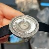 Mặt số ngọc trai đính cườm phong cách guilloche hiển thị chức năng xem giờ và phút cùng logo thương hiệu Chopard vô cùng tinh tế. Có lẽ điểm cuốn hút và không thể bỏ qua ở thiết kế này chính là rất nhiều viên kim cương chuyển động xoay tròn uyển chuyển được giữ vô hình bằng các tinh thể sapphire, nhưng dường như đang lơ lửng trong không trung, quay tròn trong một vòng xoáy vô tận của ánh sáng lấp lánh đẹp đẽ.