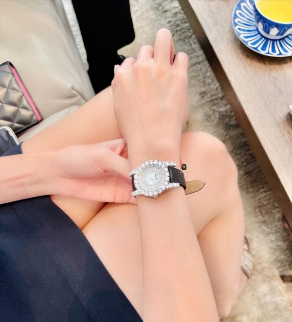 Mỗi viên kim cương được cố định bởi 4 chân có đầu dáng tròn vừa duyên dáng mà lại có khả năng siêu bền chặt. Tiếp đó, kim cương tiếp tục được nhà sản xuất nạm đều kéo dài đến càng nối dây, nơi tiếp xúc với dây đeo đồng hồ.