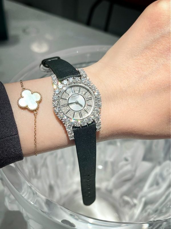 Cả chiếc đồng hồ giống như một bông hoa kim cương đang nở rộ đón những ánh nắng để tỏa sáng lấp lánh một cách kiêu sa. Với chất liệu khảm trai cùng vân Guilloche tại phần trung tâm, mặt số đồng hồ tiếp tục cho thấy cái nhìn hấp dẫn hơn. Bên ngoài lớp khảm trai trắng trang nhã là rất nhiều viên kim cương xếp kín các khoảng giữa những cọc chỉ giờ được chế tác từ vàng trắng.