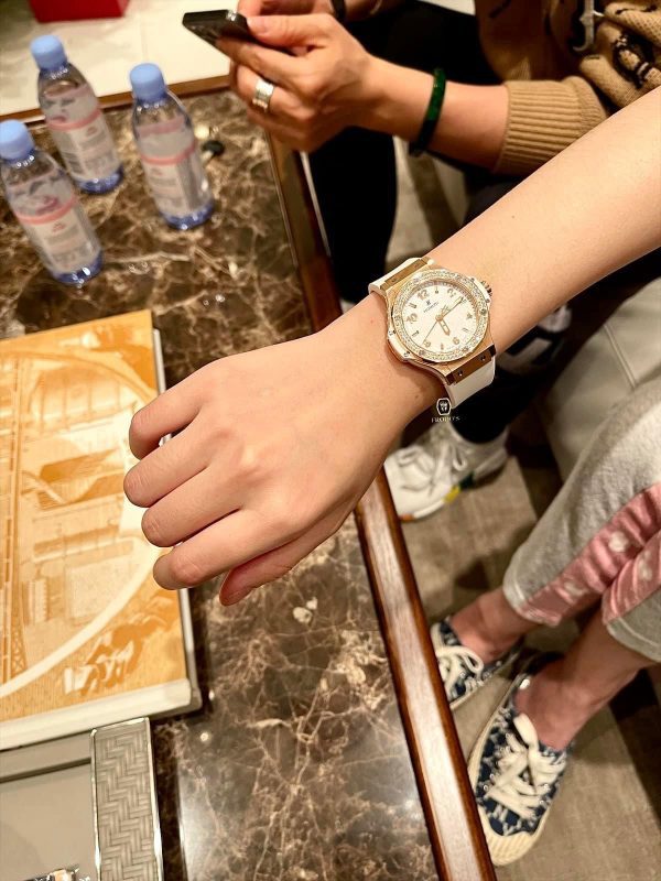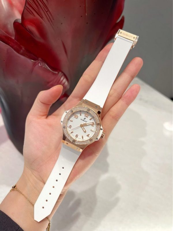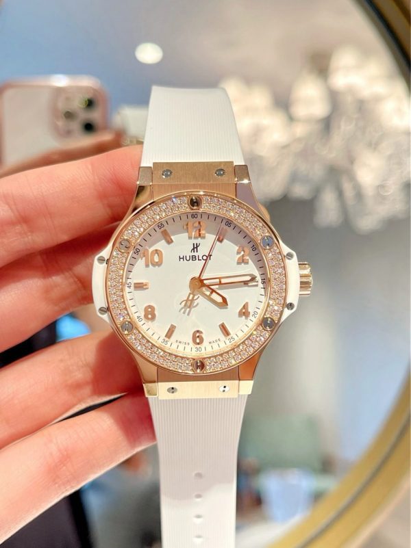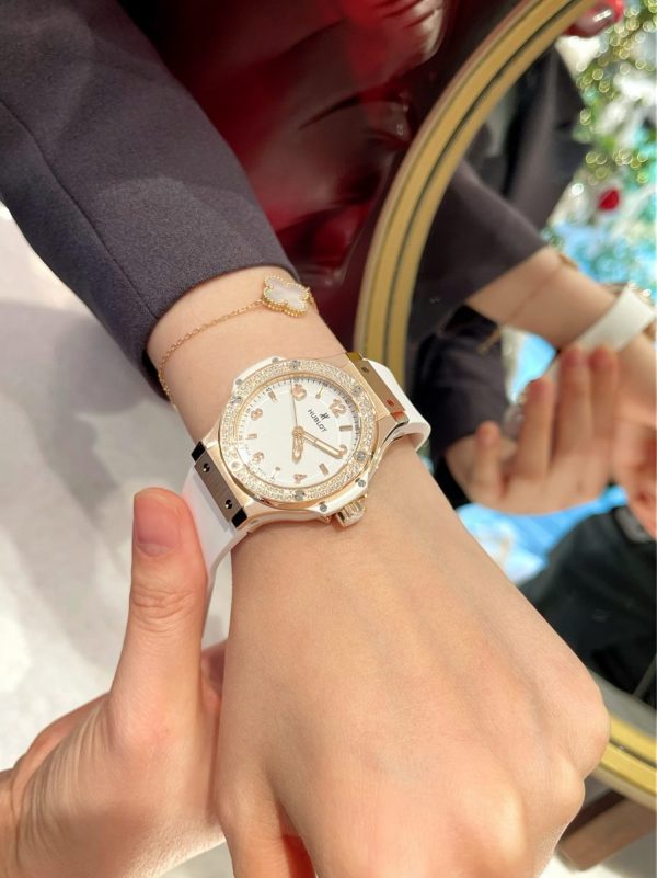 Bộ sưu tập đồng hồ HUBLOT Big Bang được giới thiệu lần đầu tiên vào năm 2005, đánh dấu một cột mốc đánh dấu bước tiến mới trong ngành chế tác đồng hồ Hublot nói chung và ngành đồng hồ cao cấp thế giới nói riêng. Một trong những chiếc đồng hồ Big Bang dành cho phái đẹp được yêu thích nhất chính là chiếc đồng hồ Hublot Big Bang Gold White Diamonds 38mm mã tham chiếu 361.PE.2010.RW.1104. Hublot Big Bang Gold White Diamonds 38mm được xuất hiện với bộ vỏ bằng chất liệu King Gold.