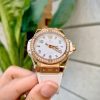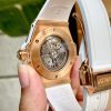 Vành bezel chế tác vàng hồng 18k và nạm 42 viên kim cương bên cạnh 6 chiếc đinh vít chữ H quen thuộc của nhà Hublot.