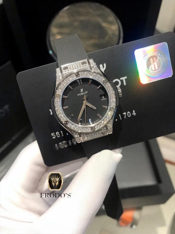 Người đeo khá là thoải mái trong phối đồ khi thiết kế đi kèm ở phiên bản này là dây da cao su, một trong những đặc điểm truyền thống ở thương hiệu này. Chất liệu vỏ Titanium được khảm 114 viên kim cương vô cùng lấp lánh, vành bezel thiết kế nổi bật với 6 vít cân đối, mang đến cảm nhận chắc khỏe cho chiếc đồng hồ, điểm nhận diện đặc trưng của những mẫu đồng hồ. Để tạo điểm nhấn Hublot đã đính thêm 36 viên kim cương.