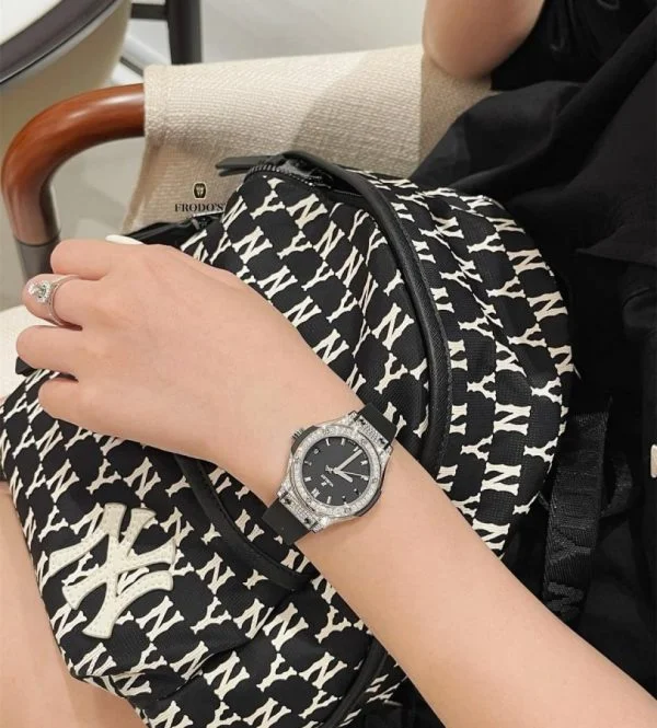 Người đeo khá là thoải mái trong phối đồ khi thiết kế đi kèm ở phiên bản này là dây da cao su, một trong những đặc điểm truyền thống ở thương hiệu này. Chất liệu vỏ Titanium được khảm 114 viên kim cương vô cùng lấp lánh, vành bezel thiết kế nổi bật với 6 vít cân đối, mang đến cảm nhận chắc khỏe cho chiếc đồng hồ, điểm nhận diện đặc trưng của những mẫu đồng hồ. Để tạo điểm nhấn Hublot đã đính thêm 36 viên kim cương.