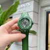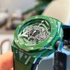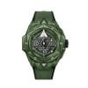 Đồng hồ Hublot SANG BLEU II GREEN CERAMIC 45mm là đứa con tinh thần của nghệ sĩ Maxime Plescia-Büchi kết hợp cùng thương hiệu đồng hồ Thuỵ Sĩ. Vỏ của đồng hồ được hoàn thiện bằng chất liệu Ceramic màu xanh lá mạnh mẽ, cực kỳ nhẹ và có độ bền hoàn hảo. Mặt số đồng hồ có kích thước 45mm lấy tone xanh lá cây Tropical dễ dàng diễn tả những đường nét nghệ thuật của bộ môn xăm mình bằng những hình thoi chồng chéo lên nhau tạo hiệu ứng 3D vô cùng đẹp mắt.