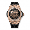Bộ vỏ xếp tầng nằm trọn trong kích thước 39mm đã được điểm thêm phần tính cách cá tính của nghệ nhân Maxime Buchi với hình ảnh vành bezel lục giác do chính anh thiết kế. Bổ sung thêm vào nét đẹp của Hulot Big Bang Sang Bleu King Gold Diamonds là 48 viên kim cương trắng tinh khiết, tương đương 0,7 cara.
