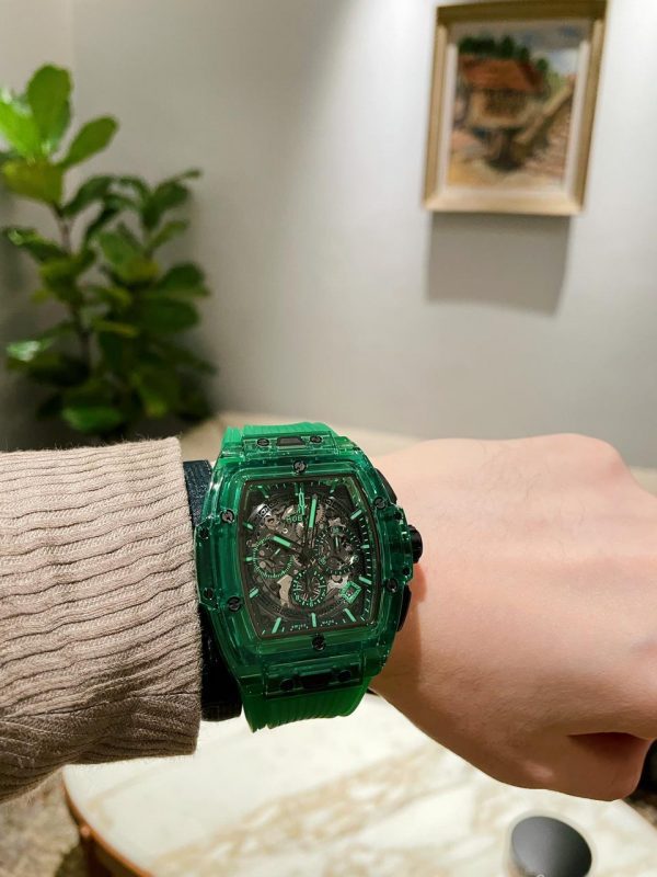 Vừa mới đây, Hublot đã chính thức cho ra mắt một mẫu đồng hồ mới với tên gọi “Hublot Spirit of Big Bang Green Saxem”, một sự sáng tạo đầy ngoạn mục với Saxem. Đặc biệt, lớp vỏ Saxem trên chiếc đồng hồ Hublot này được các nghệ nhân chế tác đồng hồ của Hublot đánh bóng tạo nên độ sáng mịn trong từng đường nét, góc cạnh. Hublot Spirit of Big Bang Green Saxem cũng được trang bị một dây đeo cao su màu xanh với những đường kẻ dọc.