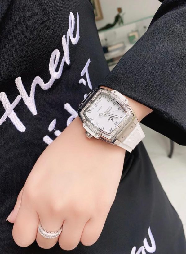 Với chiếc đồng hồ Spirit of Big Bang hiện tại, Hublot đã trang bị dây đeo cao su – đây là thế mạnh của thương hiệu từ trước tới nay. Trong màu trắng trang nhã, chất liệu cao su lại đem đến một cảm giác thoải mái khi ôm vào cổ tay trong khi những vân sọc dọc góp phần tăng thêm phần thể thao cho vị chủ nhân.