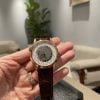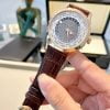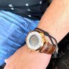 Là một chiếc Dress Watch thanh lịch, hẳn nhiên không có thiết kế dây nào phù hợp với chiếc Patek Philippe 5230R WORLD TIME hơn dây da cá sấu. Đi kèm đó, ta còn có bộ khóa bằng vàng hồng nguyên khối. Đi tiếp vào trong bộ mặt của chiếc đồng hồ, ta có thể thấy được một thiết kế tương đối phức tạp. Sự phức tạp đó đến từ tính năng Giờ thế giới, với 24 tên thành phố được đặt lần lượt ở viền ngoài mặt số, tiến vào sâu hơn một chút là vòng xoay chỉ 24 giờ