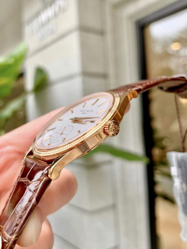 Với thiết kế cổ điển, độ dày của bộ vỏ cũng được giới hạn ở mức 8mm, dễ dàng chui vào tay áo sơ mi. Đi theo phong cách Dress Watch cổ điển, chiếc đồng hồ Patek Philippe 6119R CALATRAVA sử dụng sợi dây da đúng theo tiêu chuẩn. Chất liệu da cá sấu kết hợp hoàn hảo với lớp lót bằng da bê, tạo nên độ mềm mại và ôm sát lấy cổ tay người chủ sở hữu. Để cố định sợi dây, Patek philippe sử dụng khóa cài bằng vàng hồng với các bề mặt được đánh bóng toàn bộ.