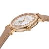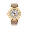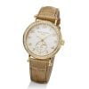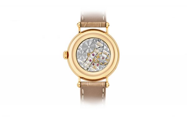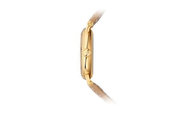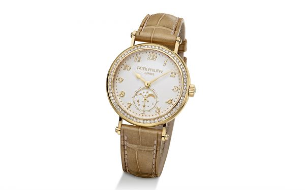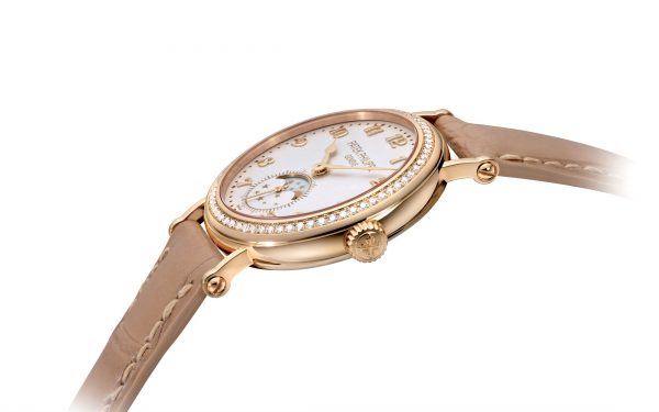 Chiếc đồng hồ Patek Philippe 7121J MOON PHASES1 được cố định trên tay các quý cô nhờ một dây đeo da cá sấu màu nâu sáng thực sự nhẹ nhàng, thanh lịch mà rất “tây”. Kết hợp với tone vàng vàng của vỏ khung, có lẽ đây là màu sắc ấn tượng nhất, khiến đôi cổ tay ngọc ngà của mọi quý cô sẽ thon gọn và nổi bật tone da hơn cả.
