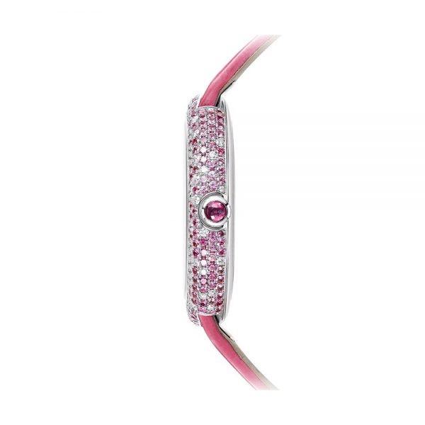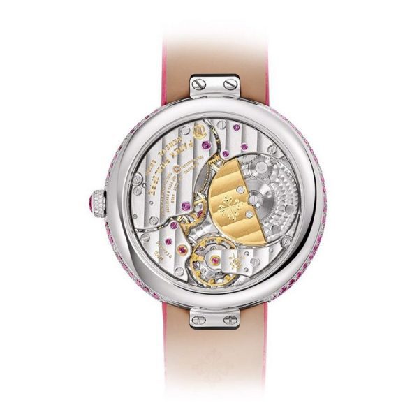 Một tuyệt tác Calatrava Haute Joaillerie dành cho quý cô thể hiện nghệ thuật chế tác thủ công đỉnh cao của Patek Philippe. Viền đồng hồ đính 149 viên kim cương (~1.1 ct.) và 182 viên sa phia hồng (~1.93 ct.). Núm đồng hồ đính 36 viên kim cương (~ 0.04 ct.) và một viên sa phia hồng cabochon (~0.11 ct.). Kim đồng hồ được chạm khắc thủ công. Mặt số bằng xà cừ cũng được chạm khắc tinh xảo và đính 98 viên kim cương cùng với 89 viên sa phia hồng. Dây da cá sấu, khoá đồng hồ được đính 65 viên kim cương và 82 viên sa phia hồng. Khung máy làm từ vàng trắng 18k. Caliber 240, Automatic. Tổng cộng có 348 viên kim cương (~1.66 ct.) và 354 viên sa phia hồng (~2.69 ct.).