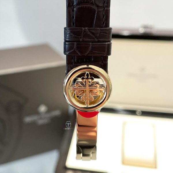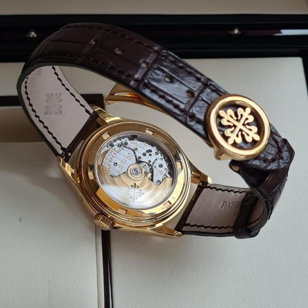 Riêng Lịch tuần trăng được chế tác với hai tông xanh và vàng champagne nằm tương phản với nhau tại góc 6 giờ, đem lại vẻ đẹp cân xứng cho một cỗ máy đậm chất cổ điển như Patek Philippe 5146J-010. Bên trong bộ vỏ khung 39mm từ vàng champagne của cỗ máy Patek Philippe 5146J-010 là bộ máy tự động với thiết kế đẹp mắt đang đập bền bỉ liên hồi.