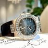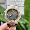 Có thể thấy, với đường kính mặt 40mm chiếc đồng hồ Patek Philippe Nautilus 5724R-001 Rose Gold – Date Moonphase phù hợp với những người có cổ tay nhỏ. Bên cạnh đó, vòng bezel và càng nối dây được khảm những viên kim cương ống cao cấp thu hút ánh sáng rực rỡ làm tỏa sáng mặt số đồng hồ. Theo thông số của nhà sản xuất thì nó được khảm 44 viên, ngoài ra còn có 12 viên ở 2 phía càng dây.