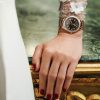Khóac trên mình mặt số tông màu nâu và được thực hiện bằng phương pháp sunburst đỉnh cao, những cọc số đính nổi phủ chất dạ quang màu trắng là một sự kết hợp ăn ý, mang lại sự hiện đại. Sự hữu ích cũng được thể hiện qua ô cửa sổ báo ngày vị trí góc 6 giờ.