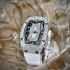 Dáng vỏ Tonneau của Richard Mille không chỉ dành cho nam giới, mà họ còn biết cách biến tấu thiết kế này để phù hợp hơn với phái đẹp. Ví dụ điển hình là chiếc đồng hồ Richard Mille RM 07-01 White Gold Full Snow Diamond MOP với kích thước nhỏ gọn hơn, tỷ lệ dài hơn được sản xuất để phục vụ những quý cô cá tính.