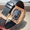Điều này làm cho bộ vỏ khá dày, tính cả mặt kính Sapphire là 16.15mm. Cùng với đó, bề dọc và bề ngang bộ vỏ cũng không hề nhỏ bé, lần lượt là 49.94 mm và 44.50 mm. Toàn bộ vỏ đồng hồ được làm từ vàng hồng nguyên khối, và còn được trang trí bởi những viên đá quý đắt giá.