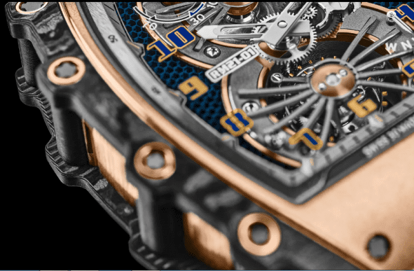 Đồng hồ Richard Mille RM 21-01 TOURBILLON AERODYNE sở hữu một thiết kế vỏ mới với cấu trúc phức tạp bằng 5N red gold được gia cố bằng khung ngoài Carbon TPT.