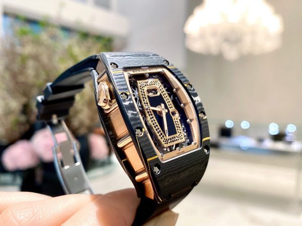 Bề mặt tạo ra hiệu ứng độc đáo, với cái chất rất riêng tạo nên khí chất đầy cá tính, khác biệt hoàn toàn với những thiết kế của nữ trước đây. Richard Mille RM 37-01 Black Carbon & Gold sử dụng bộ máy lên dây tự động Calibre CRMA1. Có trữ lượng năng lượng 50 tiếng đồng hồ, Calibre CRMA1 có thêm chức năng đọc ngày (date). Con số được hiển thị cool ngầu trên mặt đồng hồ.