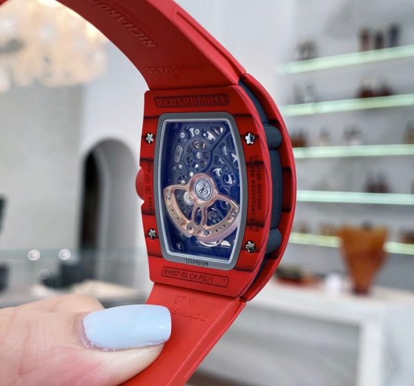 Bộ chuyển động CRMA2 in-house bên trong RM 07-01 nằm trên một tấm đế bằng titan được tráng men. Ngoài ra, Manufacture kết hợp thùng quay nhanh của nó, cần 5 giờ cho mỗi vòng quay thay vì 7,5 giờ. Cùng với roto làm bằng vàng đỏ 5N, đồng hồ mang đến khả năng dự trữ năng lượng trong 50 giờ. Richard Mille RM 07-01 Racing Red có dây đeo màu đỏ tích hợp cũng có tính năng Quartz TPT.