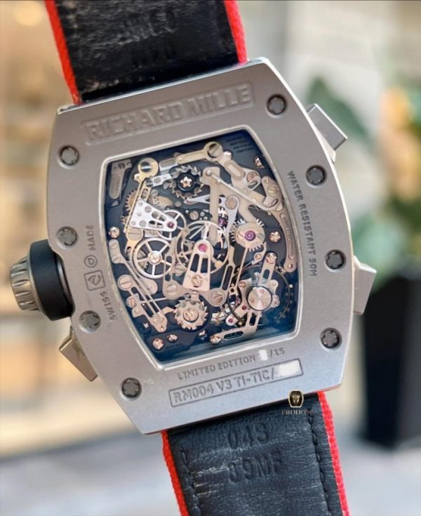 RM004 V3 Titanium Carbide Split-Second Flyback Chrono có bộ chuyển động lên dây bằng tay với giờ, phút, giây, đồng hồ bấm giờ chia giây, đồng hồ tổng 30 phút, dự trữ năng lượng, mô-men xoắn và các chỉ số chức năng. Chu kỳ 70 giờ không chạy đồng hồ bấm giờ.