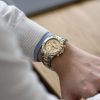 Mẫu này kết hợp mặt đồng hồ màu vàng kim với bộ đếm xoắn ốc, có vạch dấu giờ đính đá và kim đồng hồ bằng vàng 18 ct với màn hình hiển thị Chromalight, làm từ vật liệu phát quang dễ đọc.