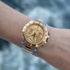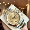 Mẫu Oyster Perpetual Cosmograph Daytona chế tác từ thép Oystersteel và vàng kim với mặt đồng hồ màu vàng kim và các vòng bộ đếm tương phản. Được phối với dây đeo Oyster, tích hợp vành đồng hồ vàng kim khắc thang đo tachymetric.