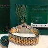 Mặt đồng hồ đi kèm khung vàng 18 ct nạm kim cương. Hiệu ứng tia mặt trời tạo ra sự phản chiếu ánh sáng tinh tế trên nhiều mẫu mặt đồng hồ của bộ sưu tập Oyster Perpetual. Phương pháp sử dụng các kỹ thuật chải thành thạo tạo ra các rãnh hướng từ trung tâm của mặt đồng hồ ra ngoài.