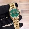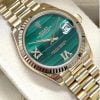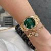Phần mặt số được thiết kế với 2 ký hiệu La Mã bằng vàng 18ct và nạm 24 viên kim cương đem lại một vẻ đẹp sang trọng, quý phái. Tất nhiên chúng ta không thể bỏ qua phần mặt số đồng hồ được chế tác từ đá lông công (Malachite) với màu lục đậm độc đáo.