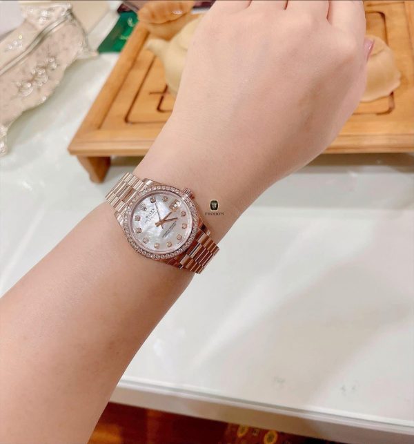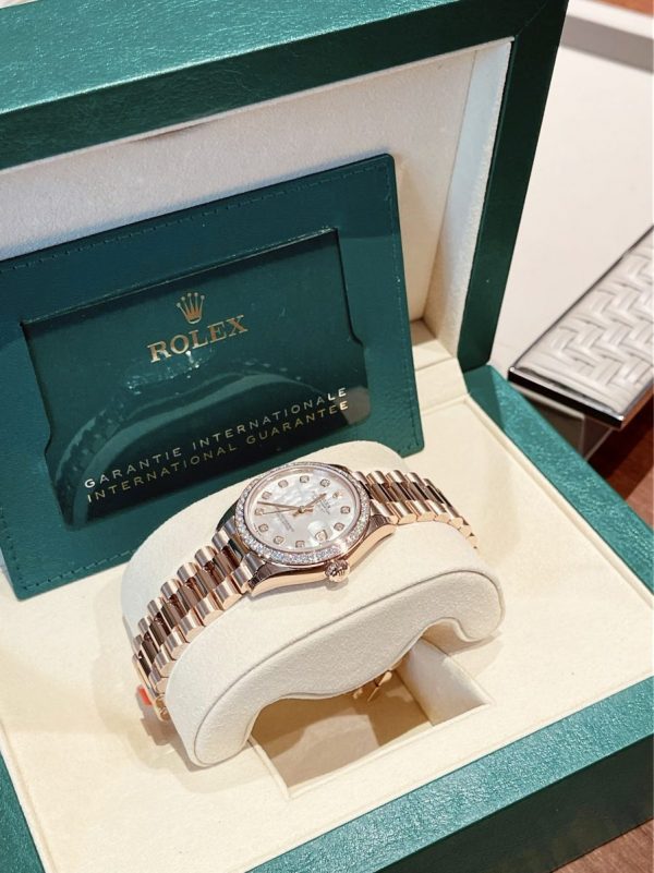 Đồng hồ Oyster Perpetual Datejust 31 bằng vàng Everose 18 ct đi kèm mặt số mặt số vỏ trai trắng nạm kim cương và dây đeo President.