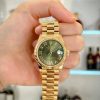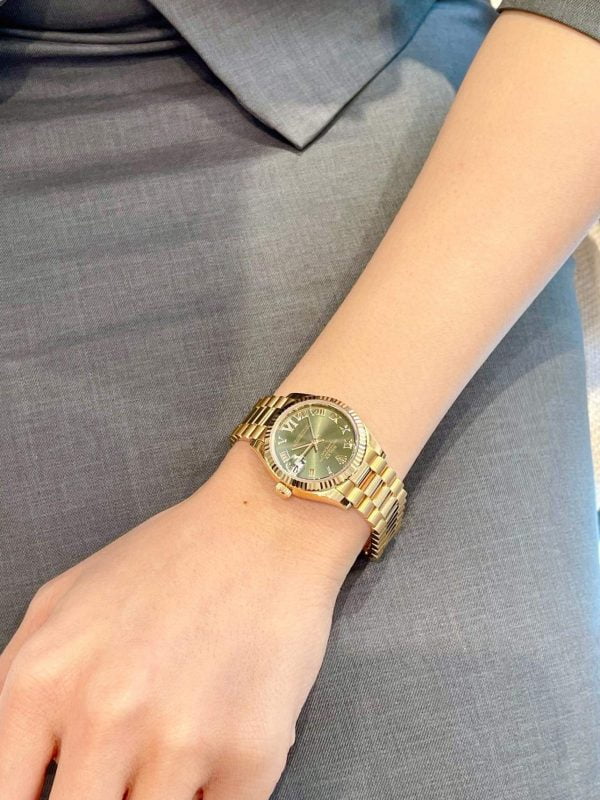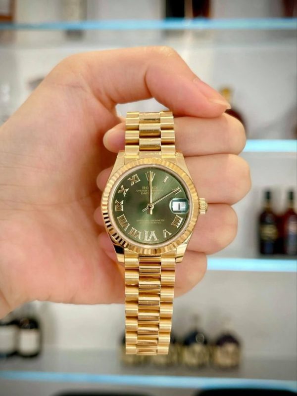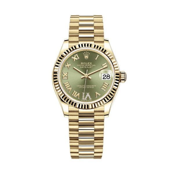 Đồng hồ Oyster Perpetual Datejust 31 bằng vàng kim 18 ct đi kèm mặt số màu xanh olive, nạm kim cương và dây đeo President.