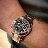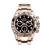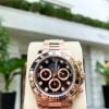Rolex Cosmograph Daytona có số hiệu 116505 xuất hiện với mặt số đen hồng nổi bật cùng bộ vỏ bằng vàng hồng đầy đẳng cấp. Sử dụng chất liệu quý hiếm bậc nhất, toàn bộ vỏ khung của chiếc Rolex Day-Date 40mm Rose Gold 116505-0015 được làm từ chất liệu vàng hồng đẳng cấp từ vành bezel, vỏ khung. 100m khả năng chống thấm nước ấn tượng của bộ vỏ khung chắc chắn có nắp đậy xoắn vít của cỗ máy thời gian này đem lại.