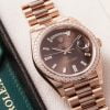 Đồng hồ Oyster Perpetual Day-Date 40 bằng vàng Everose 18 ct với mặt số màu sô-cô-la, nạm kim cương, vành đồng hồ Nạm kim cương và dây đeo President.