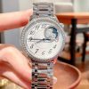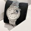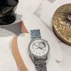 Vành Bezel được chế tác từ thép không gỉ và nạm 58 viên kim cương, tôn lên vẻ đẹp sang trọng cho đôi tay của bạn. Chức năng Moonphase theo dõi chu kỳ mặt trăng được tích hợp ở góc 1 và 2h được giới hạn trong một vòng 36 viên kim cương – vẻ đẹp huyền ảo đến từ mặt trăng. Bên cạnh đó, vòng kim cương còn được trang trí những mảnh ngọc trai để tạo ra làn mây huyền ảo và thu nhỏ bầu trời vào chiếc đồng hồ của bạn.